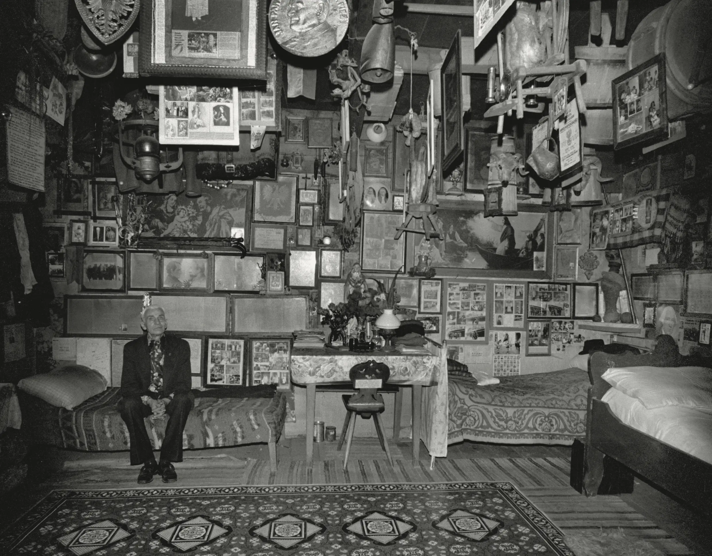 In this black and white photograph which has been blown up to nearly life size for the exhibition, an older man sits on a bed, facing us, in a large open room with the walls and ceiling completely lined with framed images and objects.