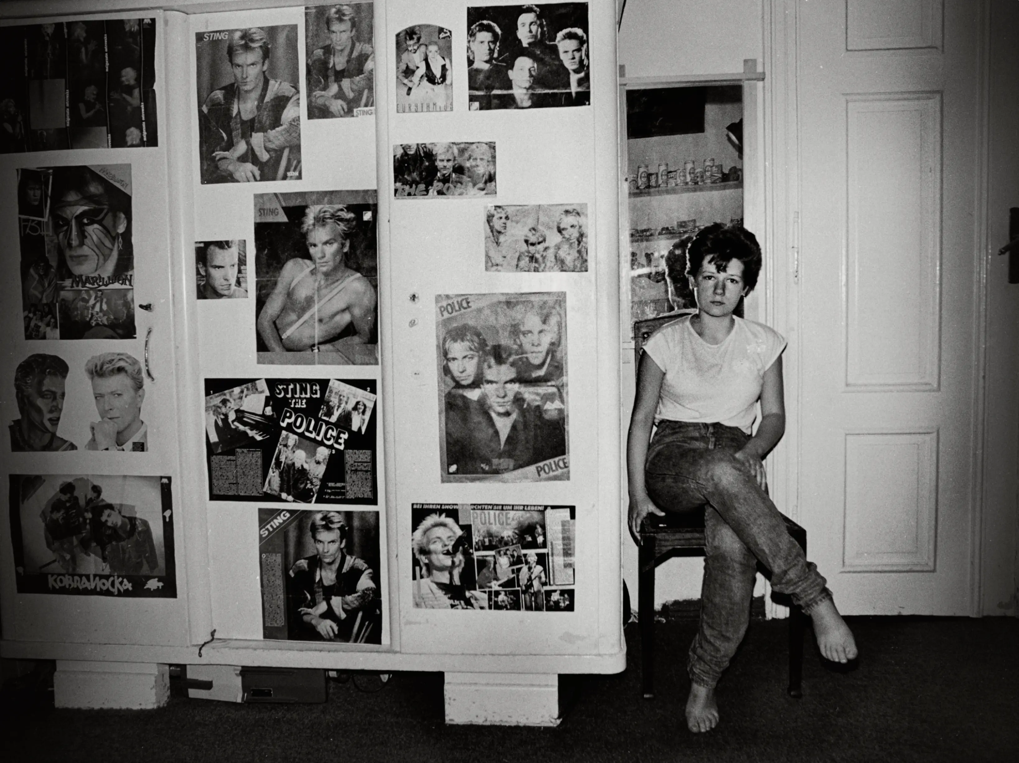 In this black and white photograph, a young woman sits facing us in what is presumably her bedroom. The furniture in the room seems to divide the image into five vertical strips. On the left, there is a triple wardrobe in white painted wood, decorated with pages from magazines showing pop stars. Most of the images are of Sting and the Police. Pride of place is given to a portrait of Sting reclining on one elbow, wearing braces over his bare chest, a centrefold from the Polish pop magazine Razem. Another photo of Sting, wearing what appears to be a multicoloured jacket, is reproduced three times at different sizes. Images of British prog-rock band Marillion and the Polish rock band Kobranocka appear on the left-hand door of the wardrobe, along with a pair of three-quarter profile photos of David Bowie that have been cut out and pasted to the door, face to face.