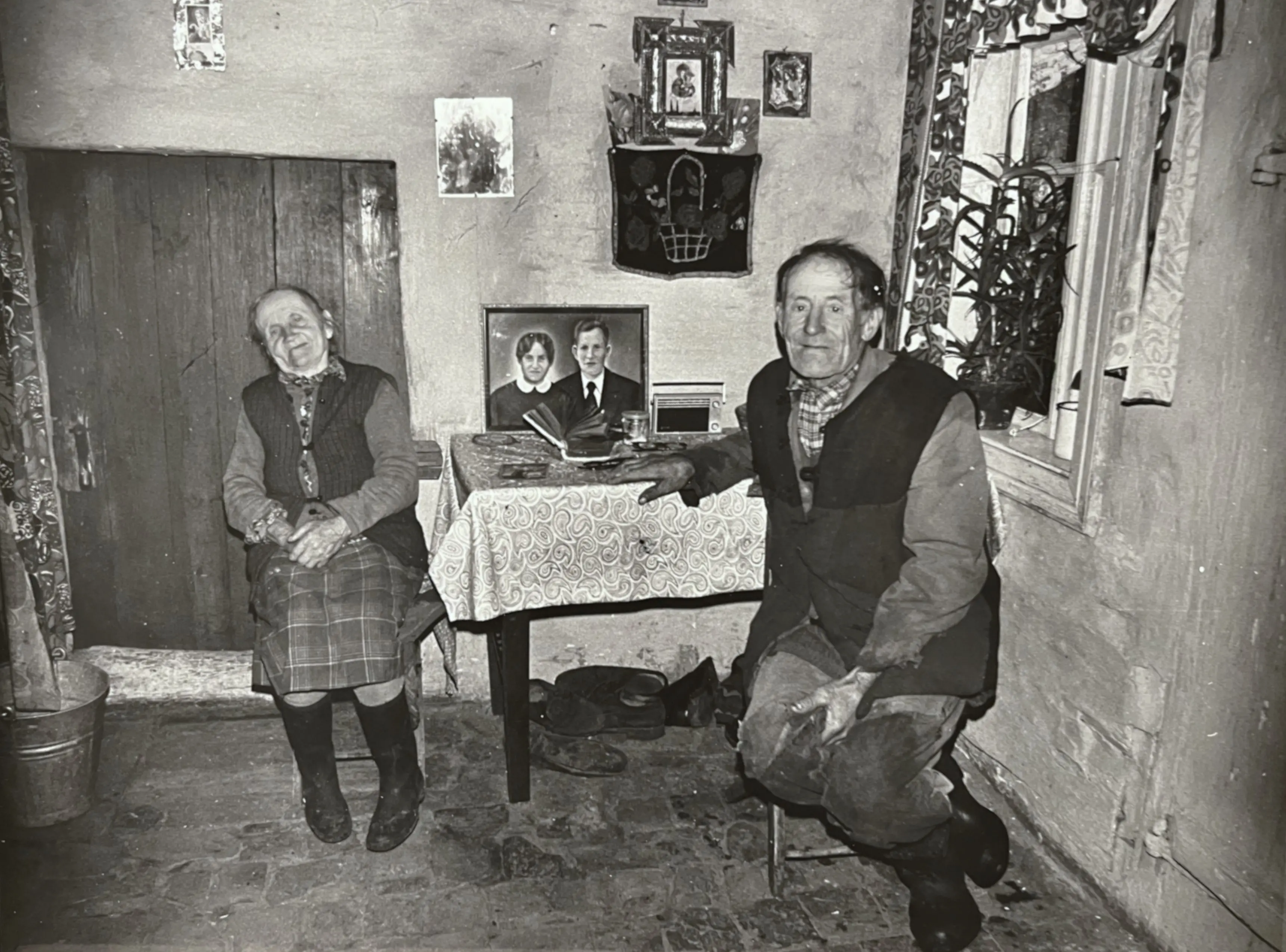 In the first photograph, an elderly couple sit facing us in the corner of a cottage room. The floor is of stone cobbles and the walls are roughly plastered. Directly opposite us is a square door of rough wooden planks, about a metre and a half high. A woman sits on a chair in front of the door, wrapped up in warm layers – a cardigan over a print blouse, with a thick woollen jerkin on top, a plaid skirt and knee-high boots. Her hands are folded in her lap, and her head is thrown back, as if she is resting it on the door, and tilted slightly to the left. Combined with her smile, this gives her a soft, amused expression.