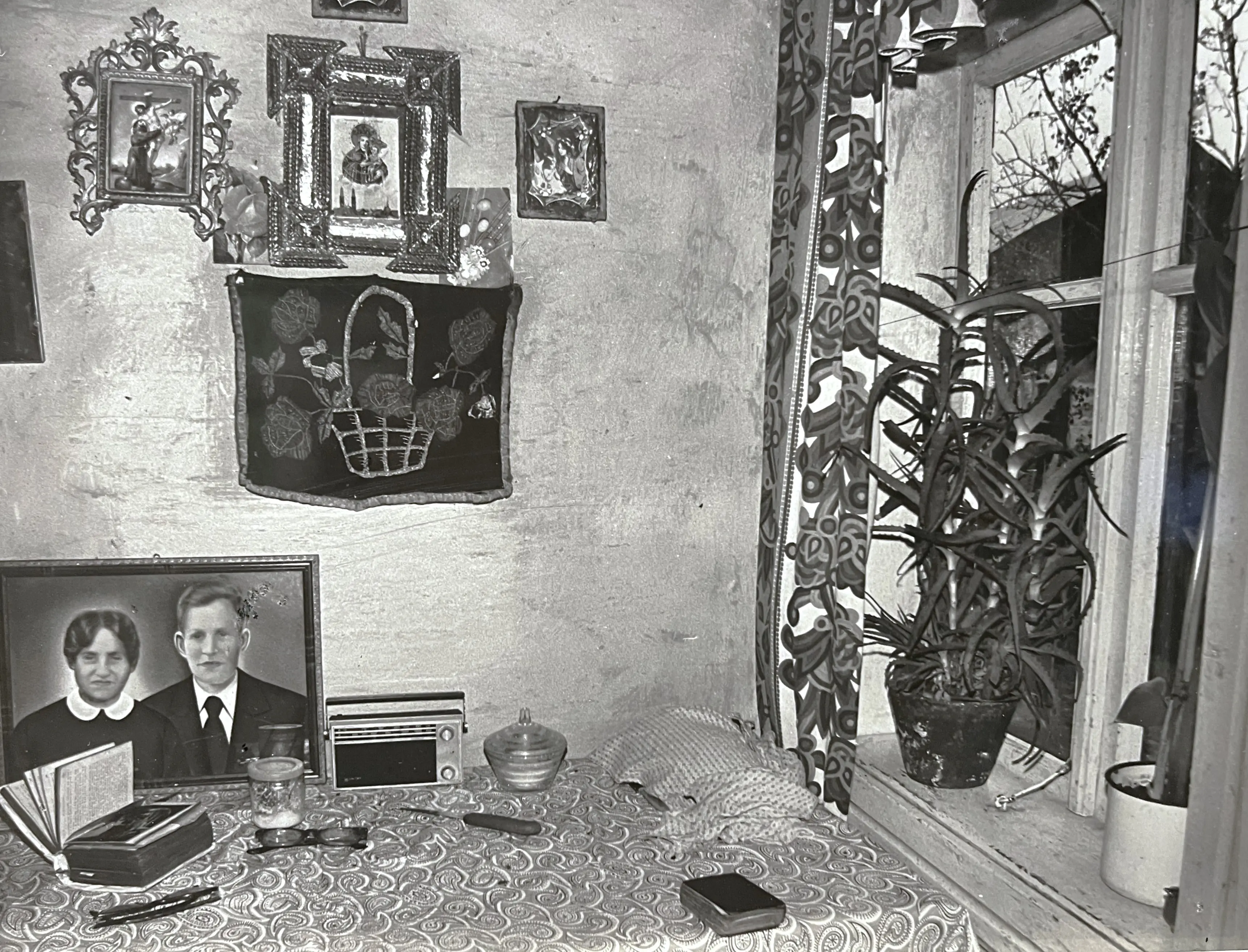 In the second photograph, the couple is absent and the focus is tighter, a still life study of the objects on and around the table. The right-hand wall holds a small window with a deep recess containing a pot plant and framed by curtains with a bold floral pattern in 1960s or 70s style. The chunky hinges of another wooden door are just visible at the right-hand edge of the frame. On the table in front of the wedding portrait, there is an open Bible and two pairs of reading glasses. To the right of the portrait there is a small transistor radio and a glass sugar pot. Another small black book, presumably a Bible, is on the edge of the table, near where the man sat.