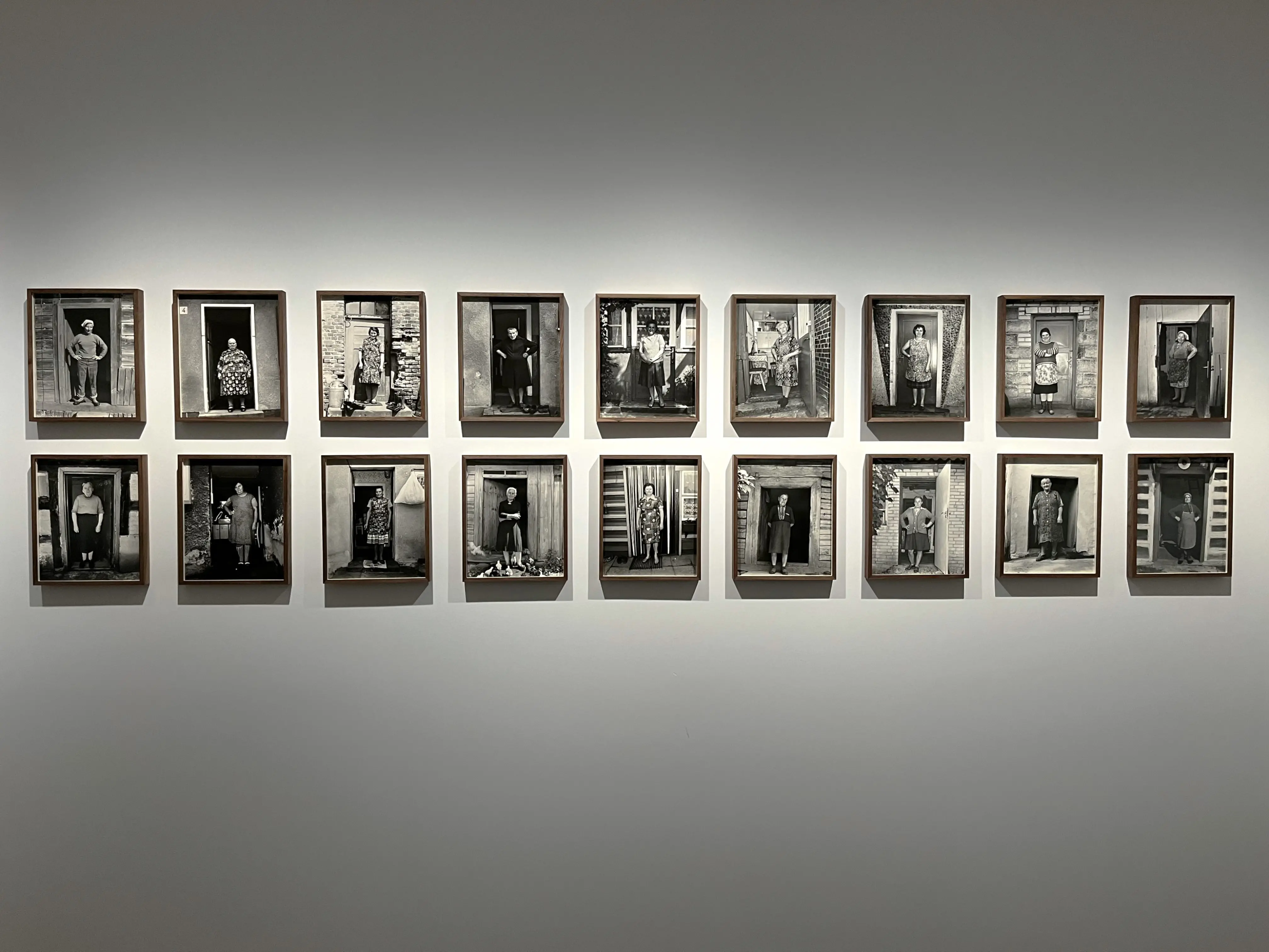 Each photograph is of a woman standing in the doorway of her home, some in the region of Podhale, in the foothills of the Tatras, and some in the more urban areas of Silesia. Zofia Rydet said of this series: ‘you can tell where the pictures were taken: if the woman is taller than the doorway to her cottage you know at once it’s Podhale, while if the door frame is far above the woman’s head, it’s Silesia.’ The repetition of the motif allows for similarities and differences to emerge. One woman stands in front of a low, almost square, doorway framed by heavy wooden logs – evidently a mountain cottage - she would need to duck her head and step over a raised threshold to enter. Others – in the more urban areas of Silesia - have twentieth-century front doors that open towards us, giving a glimpse of the kitchens beyond the women. Five of the women stand with both hands on their hips – they include women of different generations and experiences, such as a middle-aged woman wearing trousers and a headscarf, and an older woman in a severe black dress. Three wear aprons, and four wear vibrantly patterned tabards to protect the clothes during housework. There is a sense of the love of pattern that also emerges in Rydet’s documentation of interiors: many of the garments are heavily patterned, and sometimes the interlocking logs that make up the walls of the cottages have been painted with stripes. Women’s work is glimpsed at the edges of the photographs, whether in the rural or urban settings: a milk churn and several pairs of shoes and boots stand on one threshold; one woman has chickens at her feet while another has a hanging curtain of plastic strips over the doorway - presumably multicoloured - to keep flies out of the house.