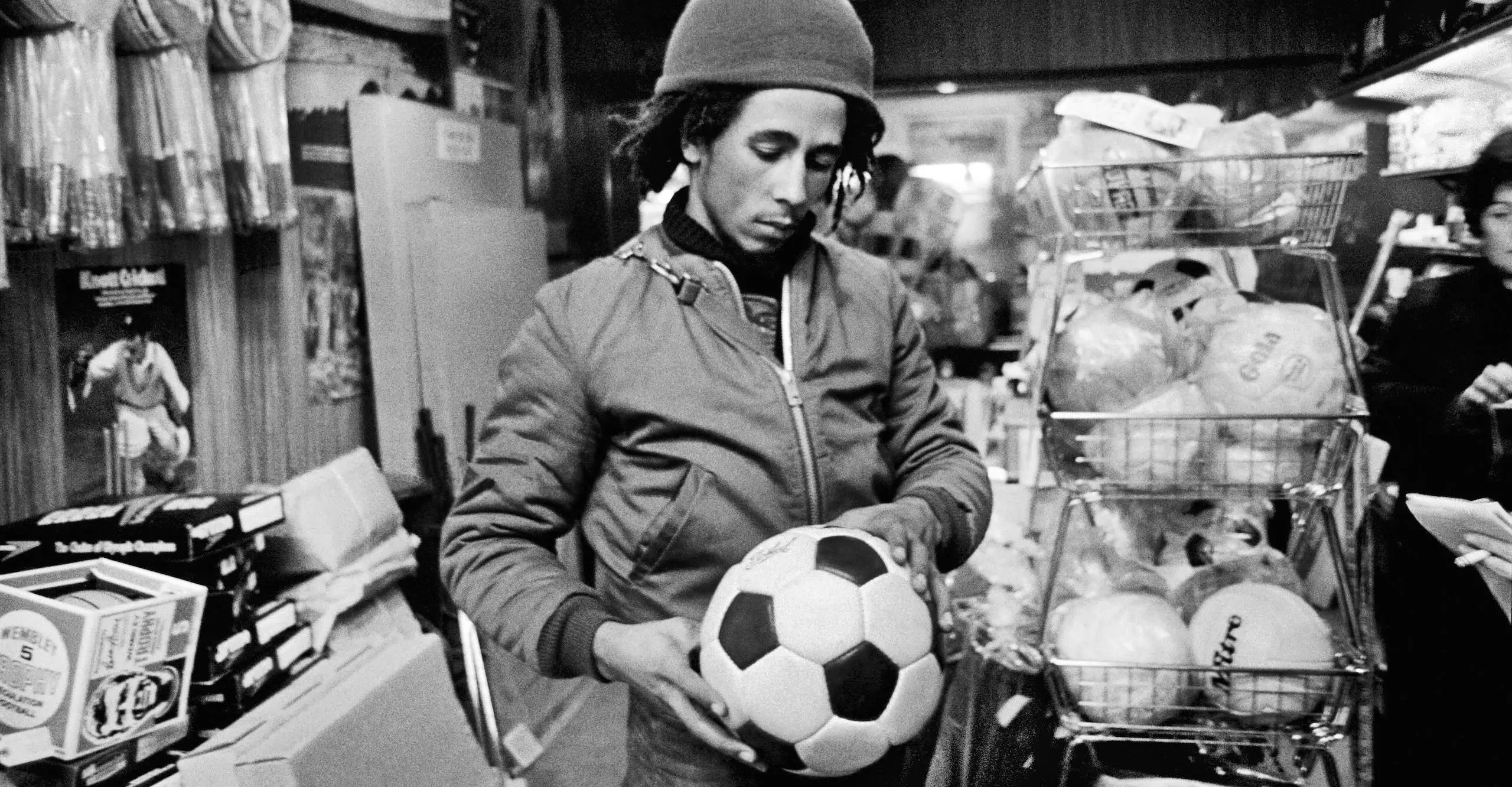 Black and white photograph of Bob Marley looking down at a football in a sports shop.