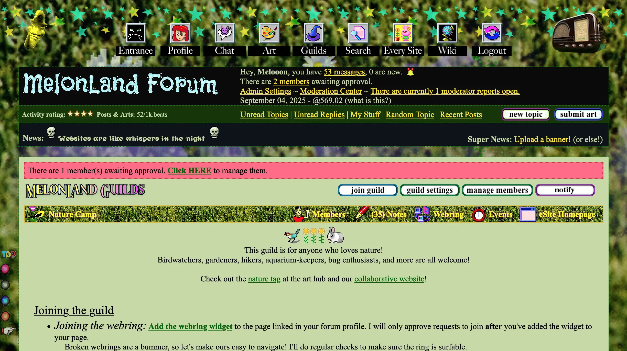 A screenshot of the MelonLand forum, natureland guilds page. The page has an bb board webcraft style.