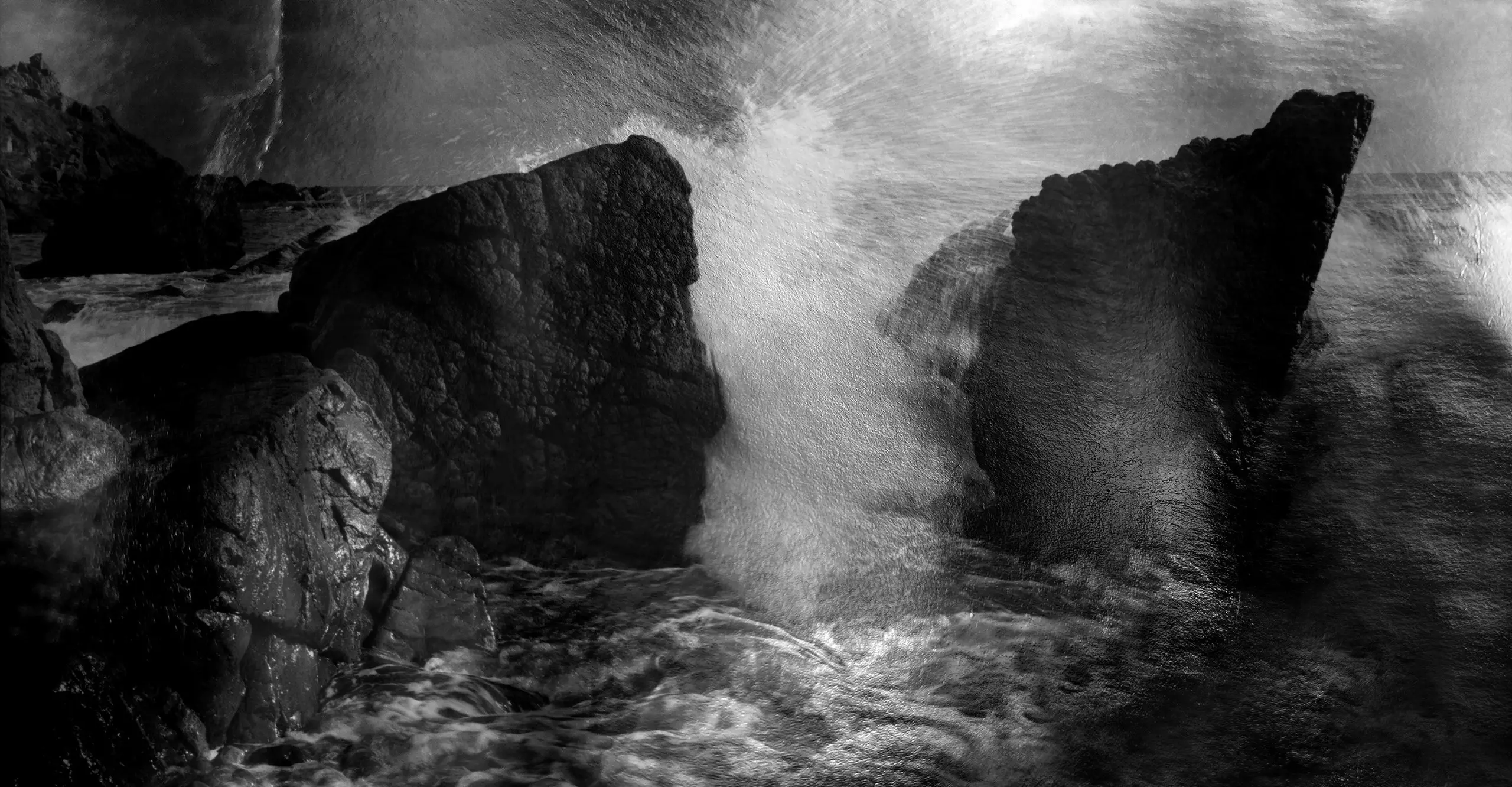 Black and white photograph of ocean waves crashing against large, jagged rocks along a rocky shoreline.