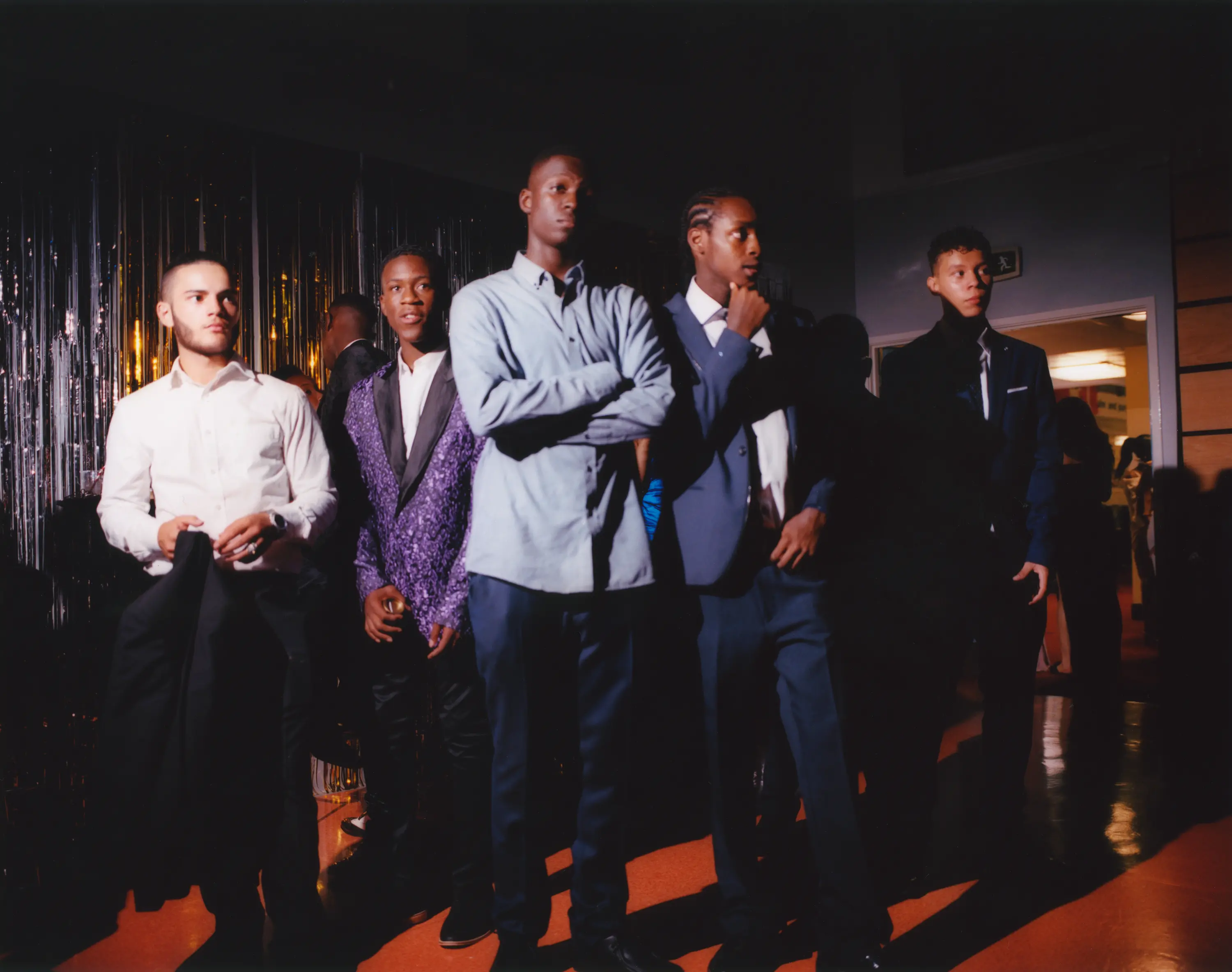 For many pivotal life events, the photograph often functions as a public trophy, symbolising success and pride, a document and proof of accomplishment. Instead, Khan immerses himself in the community, taking behind-the-scenes shots of the celebrations, candid moments of young people celebrating in sparkling dresses and evening suits. The artist documents a moment of self-expression outside of the school structure and rigid rules. The images instantly turn into nostalgia the following day when the discharged students are being start their new life.