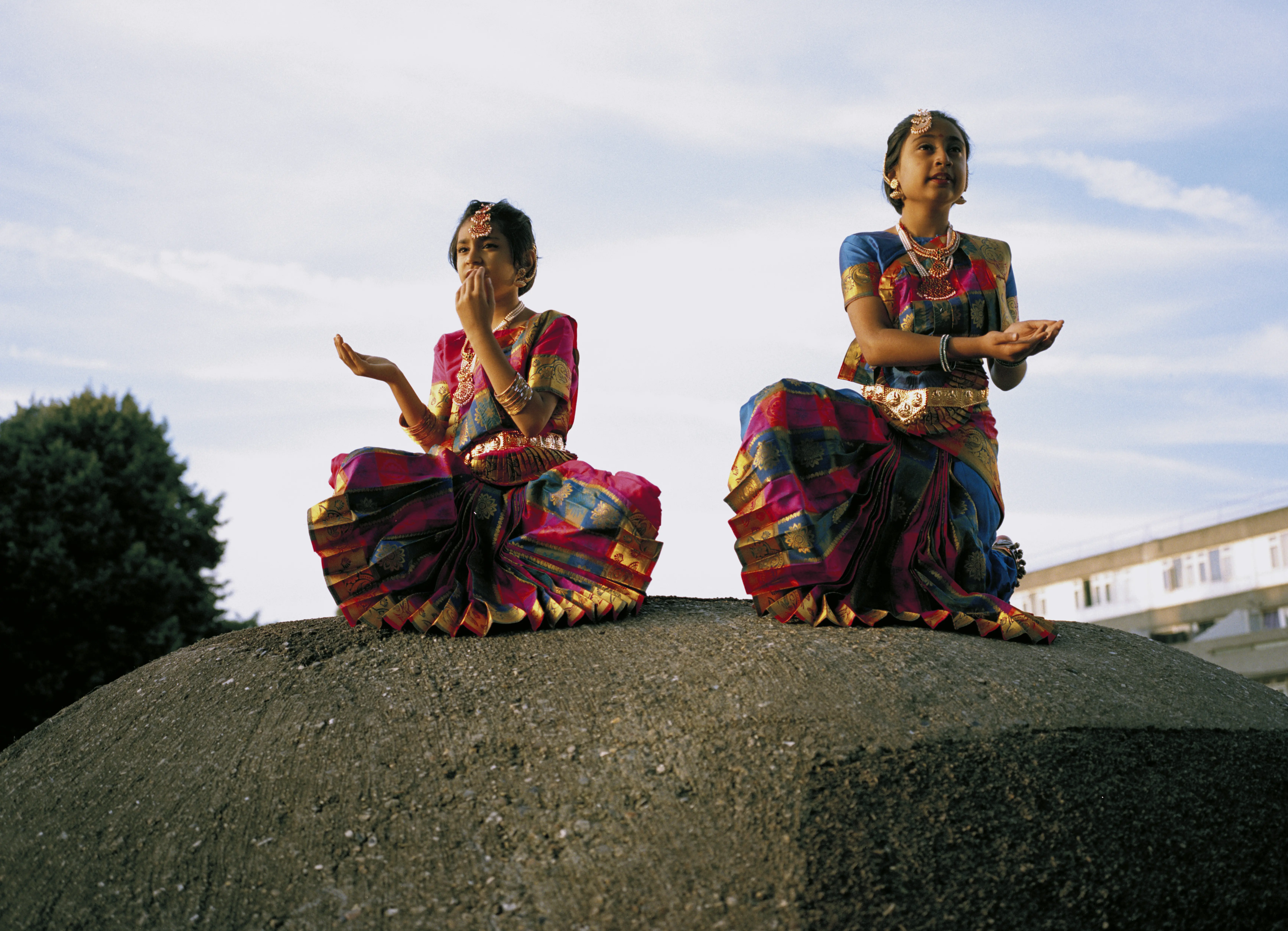 A pair of young desi women dressed in traditional clothing are shot mid-dance in a crouching pose.